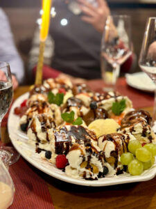 食事は前菜から始まり、メイン、そしてワイン。会話に花が咲く頃、運ばれてくるデザートは、夜を重ねるごとに豪華さを増していきました。最終日、テーブルに届いたのは、4人分とは思えないほど大きな皿に盛られたケーキやフルーツ。彼らなりの、精一杯の「おもてなし」の表現です。